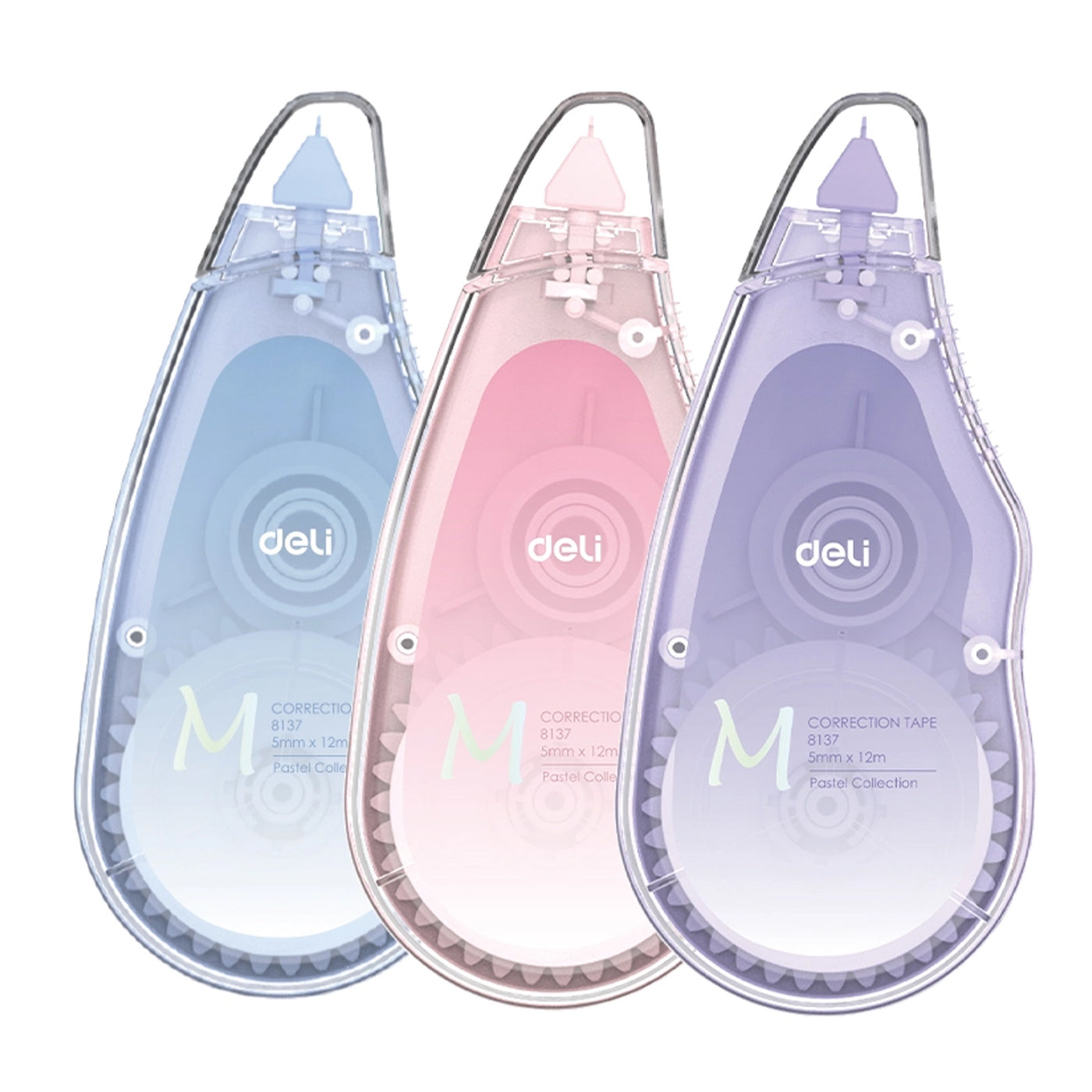 Deli Macaron Correction Tape 8137 – A compact, 5mm wide x 12m long correction tape featuring a protective cap and ergonomic design. Its tear-resistant, paper-based tape allows for immediate writing after application. Available in assorted pastel colours, it's ideal for school, office, or home use.