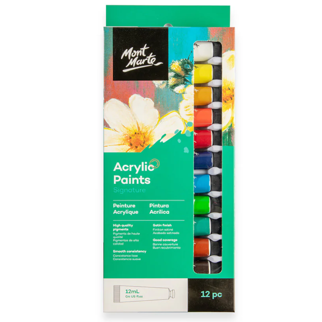 Explore your creativity with Mont Marte Acrylic Paints. This 12-piece set includes 12ml tubes of vibrant, high-quality colours, perfect for artists of all levels. Ideal for canvas, paper, and more.