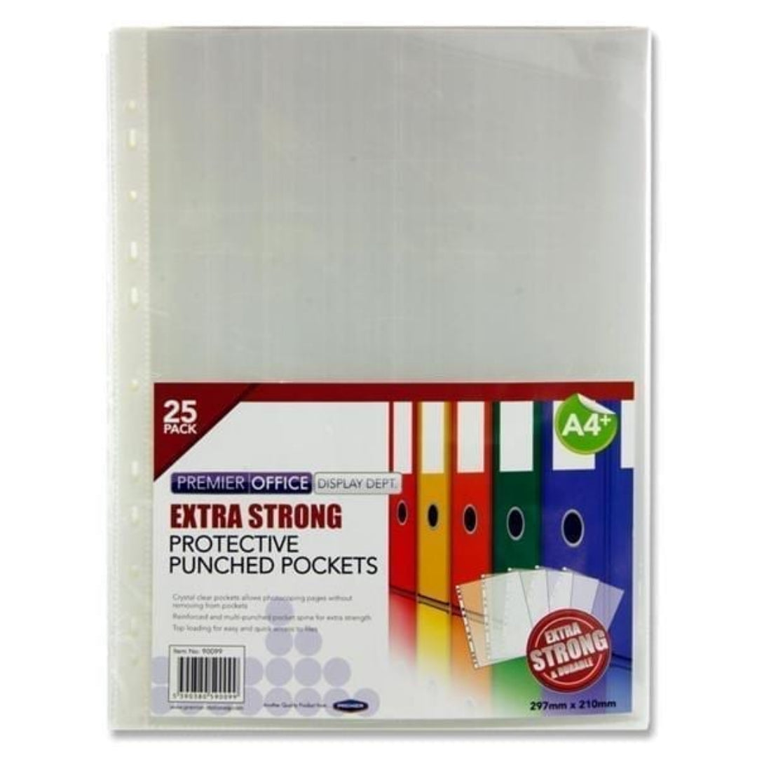 Keep your documents safe and organized with this pack of 25 Premier Office A4+ Extra Strong Protective Punched Pockets. Designed for durability, these clear sleeves are perfect for storing and protecting important papers. The extra strength material ensures long-lasting use, while the punched holes make them easy to file in any binder. Ideal for both home and office use.