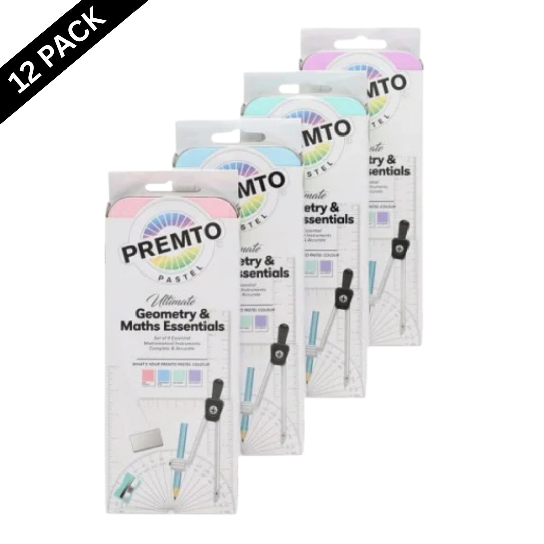 Add a soft touch to school supplies with this box of 12 Premto 9-Piece Maths Sets in 4 pastel assorted colours. Each set includes all essential geometry tools—ruler, compass, protractor, set squares, and more—neatly stored in a compact, durable case. Ideal for students of all ages, these stylish pastel sets are perfect for classrooms, exams, or home learning.