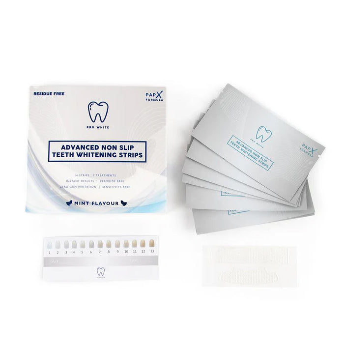 The Pro White PAP-X Advanced Teeth Whitening Strips are designed to provide a brighter smile without causing tooth sensitivity. Utilizing the PAP-X formula, these strips effectively whiten teeth by targeting stains and discoloration. They are peroxide-free, making them a gentler alternative to traditional whitening products. The strips are easy to use and come with a shade guide to track your progress.