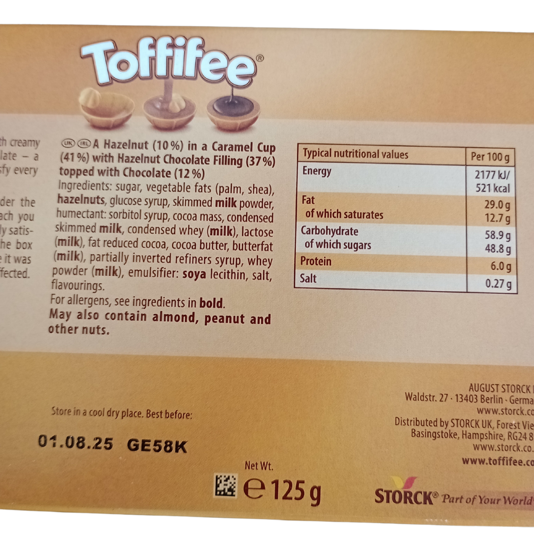Indulge in the irresistible combination of creamy caramel, smooth nougat, and crunchy hazelnuts with Toffifee Box 125g. Each piece of this luxurious treat features a whole hazelnut surrounded by rich nougat, coated with smooth caramel and finished with a delicious chocolate topping. Perfect for gifting, sharing, or enjoying on your own, Toffifee offers a satisfying, premium candy experience that is perfect for any occasion.Ingredients: sugar, vegetable fats (palm, shea), hazelnuts, glucose syrup, skimmed milk powder, humectant: sorbitol syrup, cocoa mass, condensed skimmed milk, condensed whey (milk), lactose (milk), fat reduced cocoa, cocoa butter, butterfat (milk), partially inverted refiners syrup, whey powder (milk), emulsifier: soya lecithin, salt, flavourings.For allergens, see ingredients in bold.May also contain almond, peanut and other nuts.