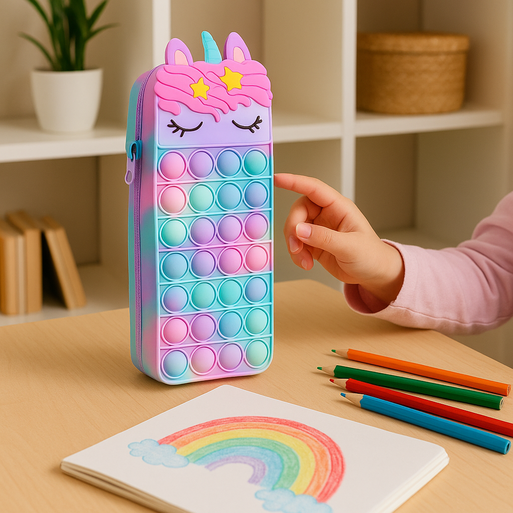 Bring a touch of magic to your child’s school day with this Unicorn Pop It Fidget Pencil Case! Made from soft, durable silicone, this enchanting unicorn-themed case features a pop bubble surface that doubles as a fun and calming fidget toy. Perfect for reducing stress and boosting focus, it's ideal for kids who love tactile play. With a secure zip closure and ample room for pens, pencils, erasers, and more, it’s the perfect blend of whimsy and practicality for school, home, or travel.